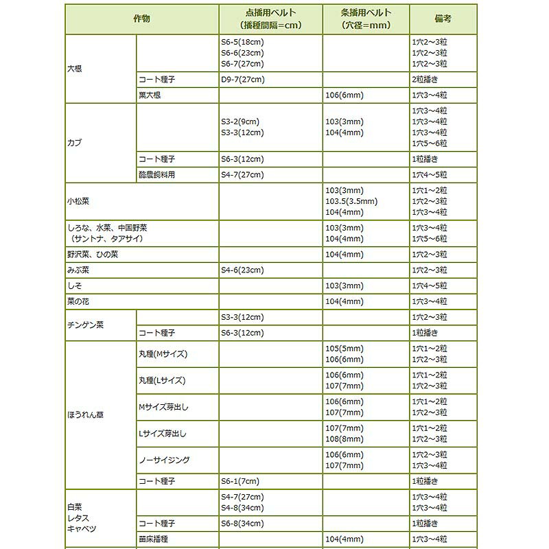 ・一覧表に示されたベルトは、各作物毎に全国標準的に使用されているものです。